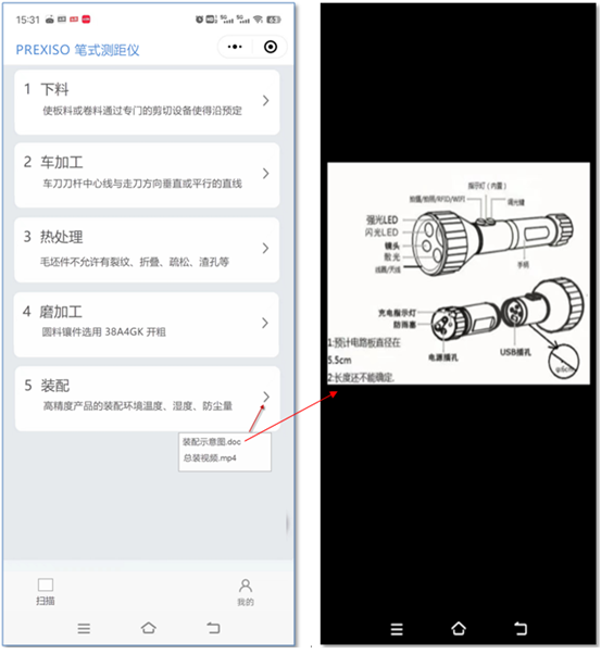 掃描二維碼,后顯示下圖,能查看當前產品的工藝步驟,點擊某工藝步驟后 ,查看針對的工藝文件