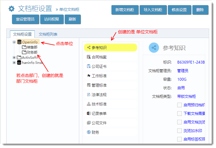 1)創建(文檔柜),并設置文檔柜管理員及文檔柜回收箱管理員。(文檔柜管理員與回收箱管理可以是不通的人;超級管理員不能是文檔柜管理員)
