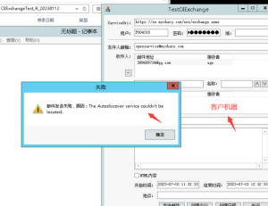 exchange發送郵件提示T he Autodiscover service couldn’t belocated. 2024/01/03 分類:產品中心 問題中心 項目管理 747 配置好了服務發送郵件,在客戶本機用測試工具測試 提示 拿到EWS? (https://ex.XXXX.com/ews/exchange.asmx),確定這個地址可以在 客戶本機上能夠打開? ,如不能那就是服務器上網絡權限做了限制不允許訪問 導致以上問題 正常應該是 結論:請服務器管理員允許該地址進行外網訪問 標簽:客戶郵件問題 上一篇: gungho 網站加載慢 下一篇: Mobox 垃圾文件清理不生效的排查方法