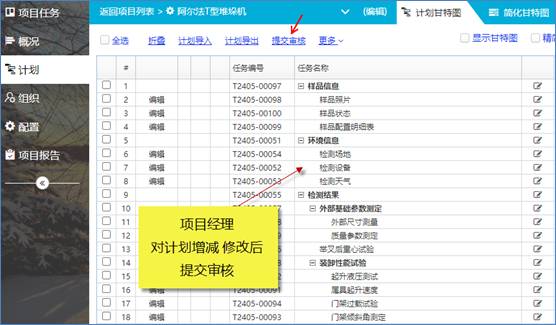 項目經理,進入項目后,對計劃還可以做進一步微調,確定后,提交審核。項目計劃審核一旦通過。系統根據計劃任務的開始日期自動創建任務分發給相關測試人員。