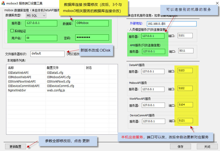 修改Mobox3系統數據庫連接及相關服務端口 2024/07/25 分類:產品中心 產品手冊 視頻中心 677 修改Mobox3系統數據庫連接及相關服務端口的作用 1、我們在實施的時候,一個工程師可能負責多個項目。而每一個項目會有自己的mobox數據庫。為了方便一個mobox3系統隨時切換不同的項目。我們可以通過修改其數據庫連接來完成 2、mobox3的端口修改,是因為,mobox3用到的端口,可能甲方不讓用,我們需要修改 實現過程 1、下載mobox3配置修改工具 點擊下載 下載后,解壓 2、按說明進行修改相關參數 參考視頻: http://m.008y.cn/wp-content/uploads/2024/07/mobox3cfg-modify.mp4 標簽:手冊視頻 上一篇: SQLServer數據庫備份 下一篇: mobox數據異地備份部署方案