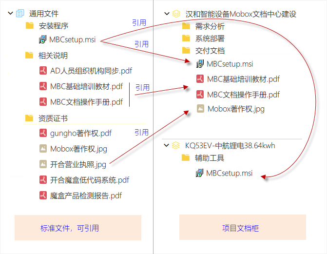 Mobox的引用文件管理功能與制造業(yè)中的借用件管理很相似。完美的解決了一個(gè)文件在不同文檔柜、文件夾中的多次出現(xiàn)(降低的存儲(chǔ)空間),也可以實(shí)現(xiàn)原始文件修改后,引用該文件的文件夾內(nèi)的文件也會(huì)自動(dòng)更新。