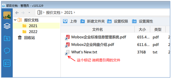這種管理方式好處是簡單,壞處是無法體現(xiàn)這是一個(gè)相同的文件。Mobox文檔管理系統(tǒng)可以很好的管理這類文件。我們的相同文件存放在不同的文件夾,采用了引用文件的方式來管理。
