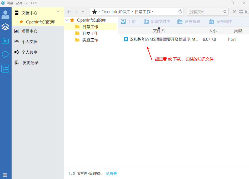 歸檔后,對(duì)文檔柜有權(quán)限的用戶就能通過文檔系統(tǒng)下載或?yàn)g覽這些知識(shí)文件
